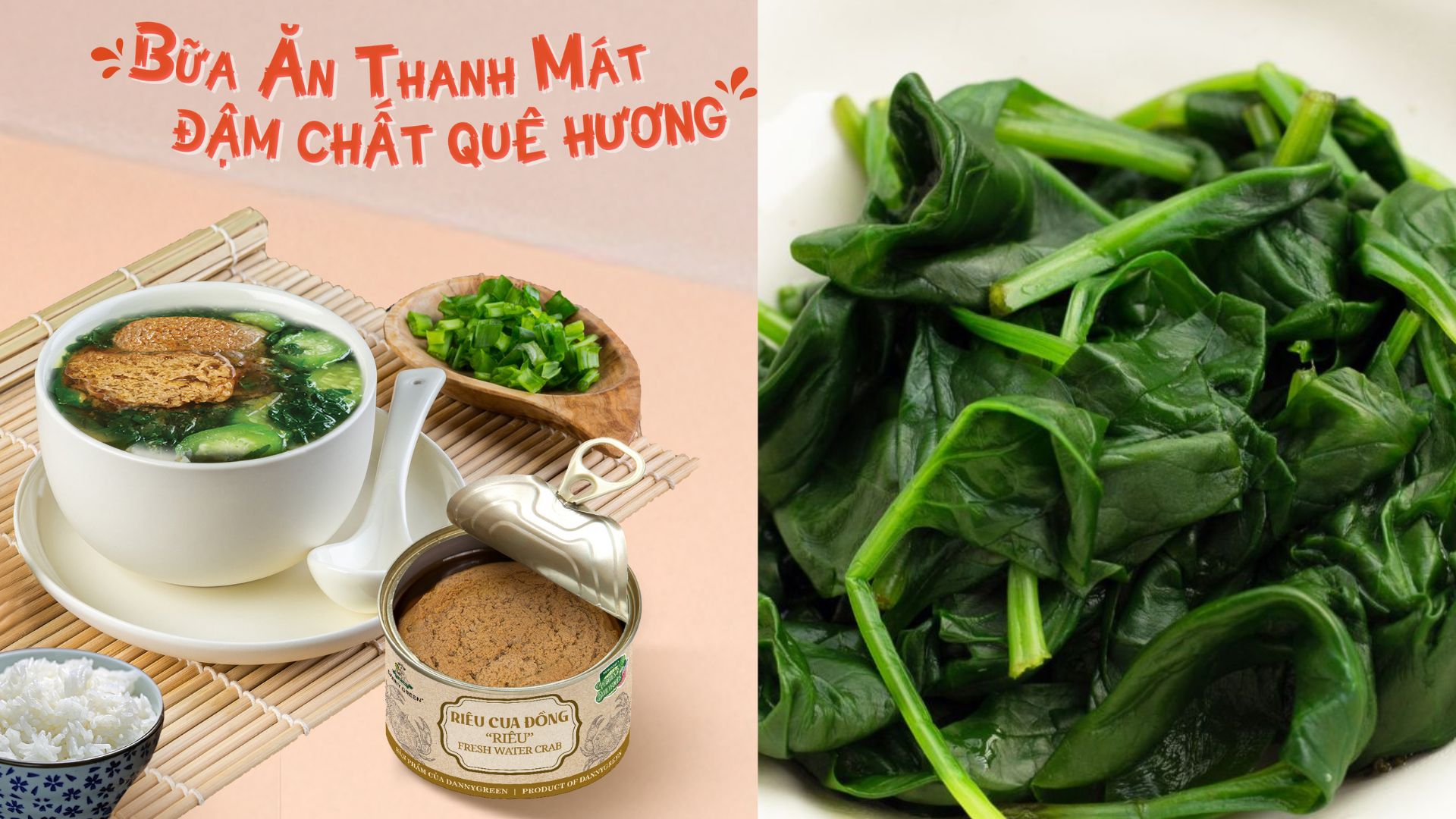 Một combo chuẩn vị, vừa thanh, vừa đậm đà. Riêu Cua Đồng DannyGreen được chế biến từ cua đồng tươi nguyên chất, giữ trọn vị béo ngậy và hương thơm đặc trưng. Chỉ cần vài phút chế biến cùng cà chua, đậu hũ, thêm chút hành phi là bạn đã có ngay nồi canh riêu cua thanh mát, chuẩn vị truyền thống cho bữa cơm gia đình. Khi ăn kèm Cải Bó Xôi Hữu Cơ DannyGreen luộc, bạn sẽ cảm nhận được sự cân bằng hoàn hảo: vị riêu đậm đà hòa quyện cùng vị thanh mát của rau, tạo nên bữa cơm dân dã mà vẫn đầy đủ chất xơ và khoáng chất.